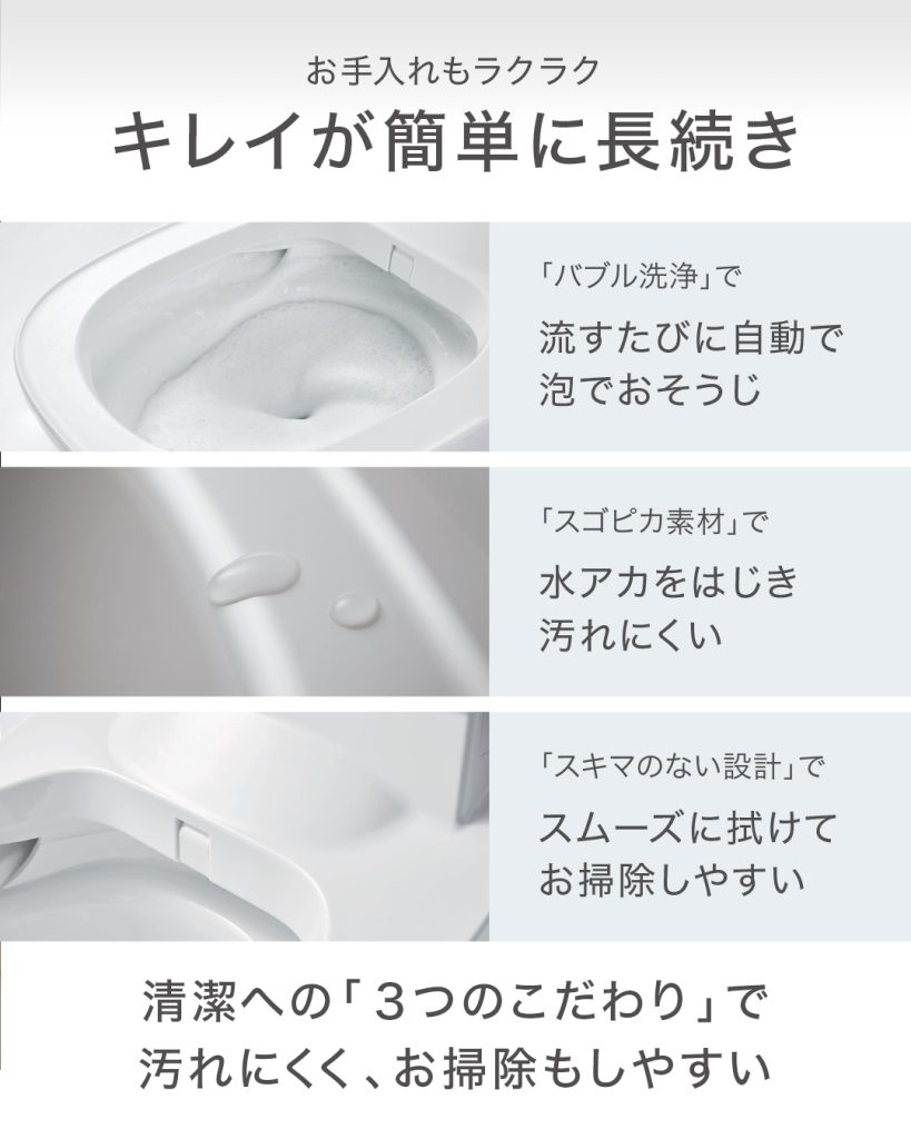 さらに、使うたび自動でお掃除してくれる「#バブル洗浄 」、陶器に比べて水アカ汚れが付きにくい独自素材「#スゴピカ素材 」、汚れが入り込みやすい隙間がなくお手入れしやすい「#スキマレス設計 」など、清潔さに配慮した機能も多数搭載。空間の美しさ、清潔さを簡単にキープできます。