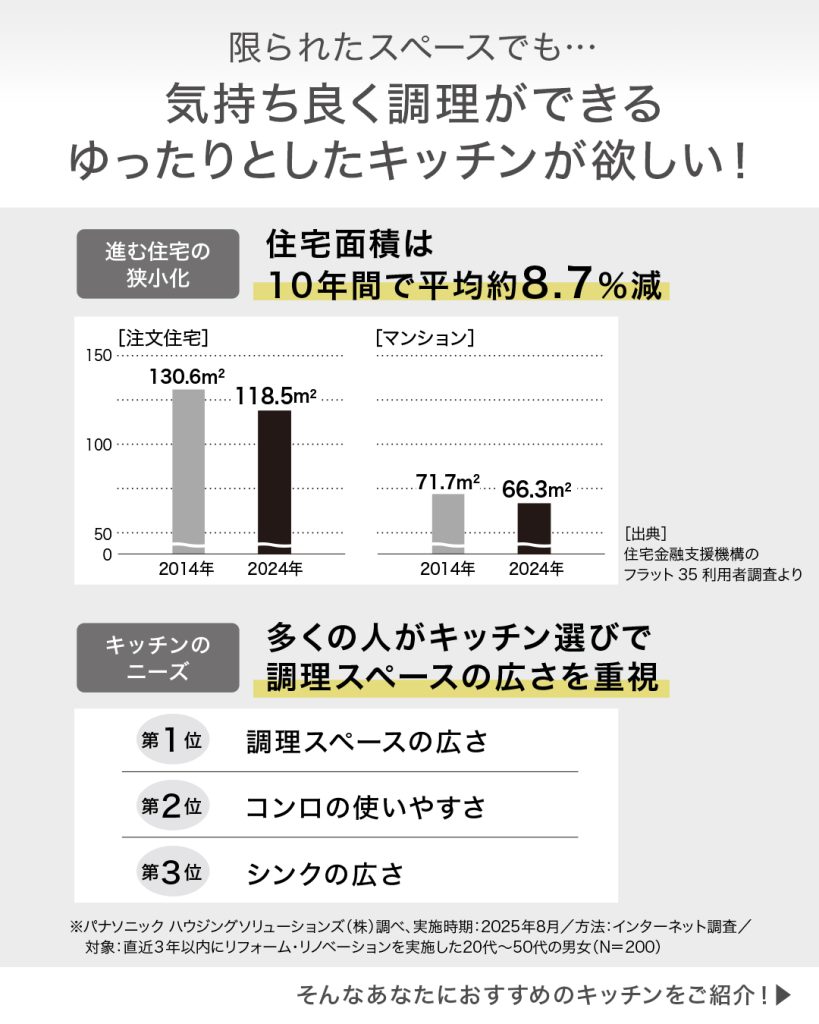 しかし、パナソニック ハウジングソリューションズ(株)が実施したアンケートによると、キッチンにおいて多くの人が「調理スペースの広さ」を重視しているという結果に。でも、せっかくリフォームするなら、キッチンの快適さもしっかりアップさせたいですよね。