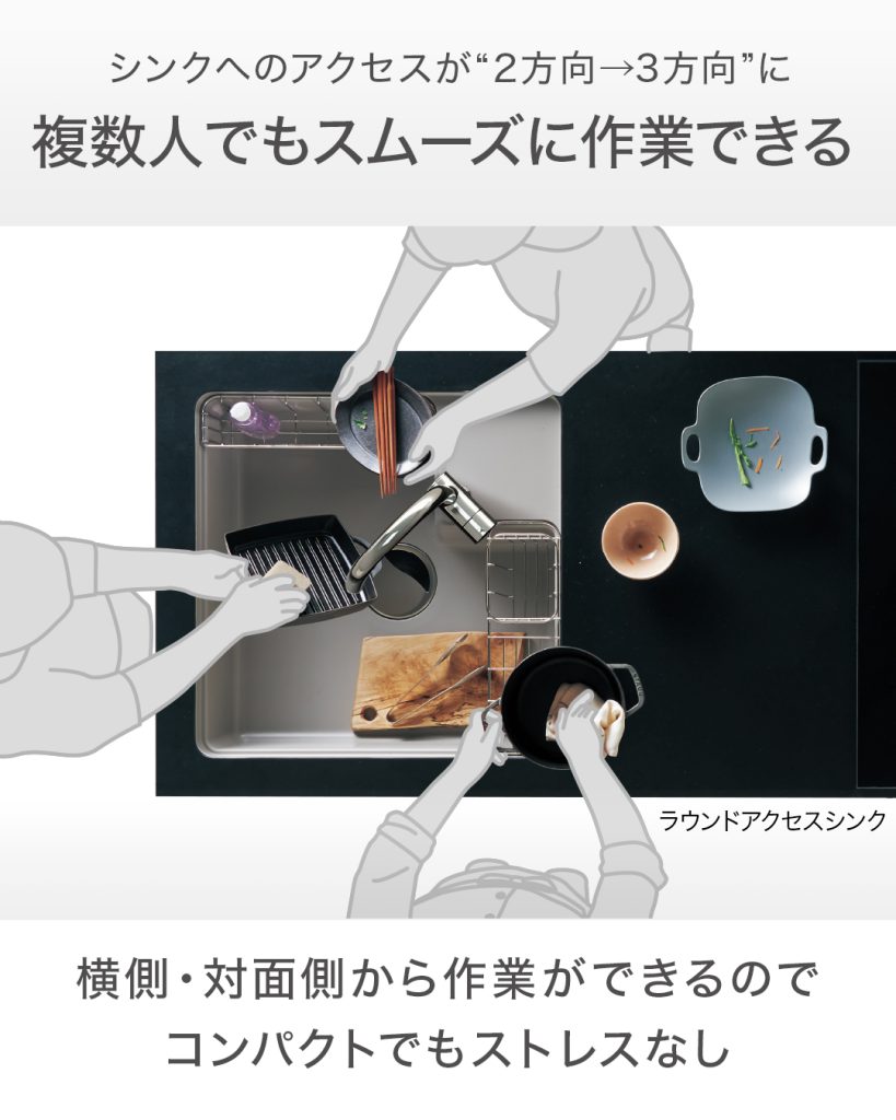 省スペースでも設置がしやすい上、3方向からシンクが使える「ラウンドアクセスシンク 」
