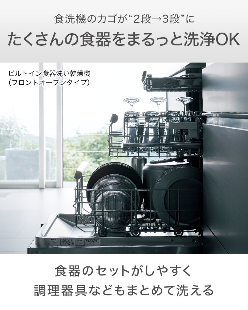 大容量の3段式で調理器具などもまとめて洗える「#フロントオープン食洗機 」