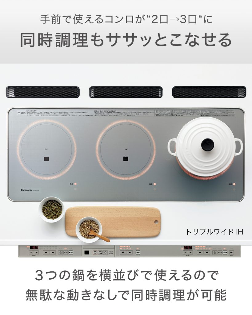 3つの鍋を横並びで使えて同時調理がしやすい「#フラットワイドコンロ 」など、高機能の設備を多数搭載。