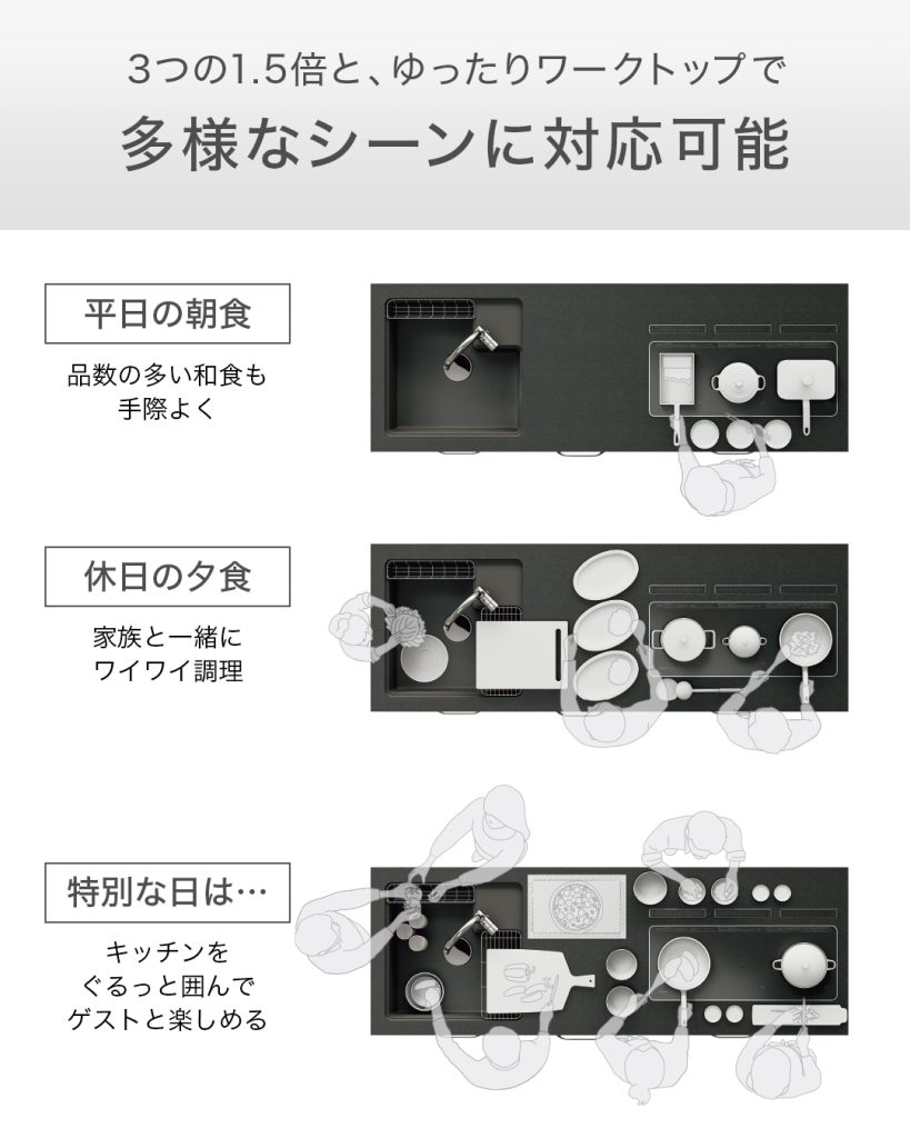 さらに、無駄のないワークトップ設計で、一般的なキッチンよりも横幅を抑えながら広々とした作業スペースを実現。高機能と広々としたワークトップで、多様な生活シーンに対応できます。