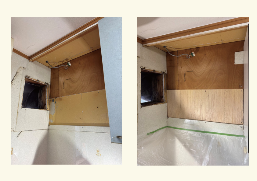 全て撤去したところ本体設置面下半分ほどが石こうボードの為、補強の為、木下地を入れます。