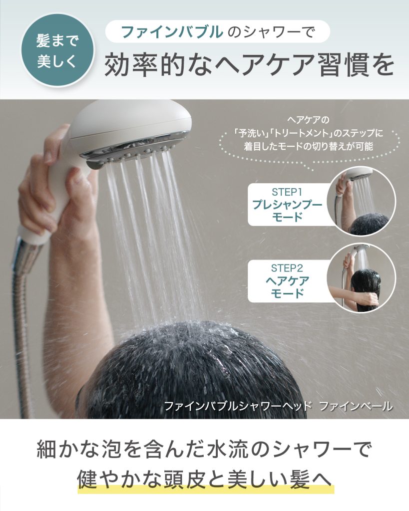 ファインバブルと5つのモードでヘアケアの効果を高めてくれる、「ファインバブルシャワーヘッドファインベール 」で、入浴ついでの“ながらセルフケア”が可能。入浴時にカンタンに無理なくセルフケアが可能です。
