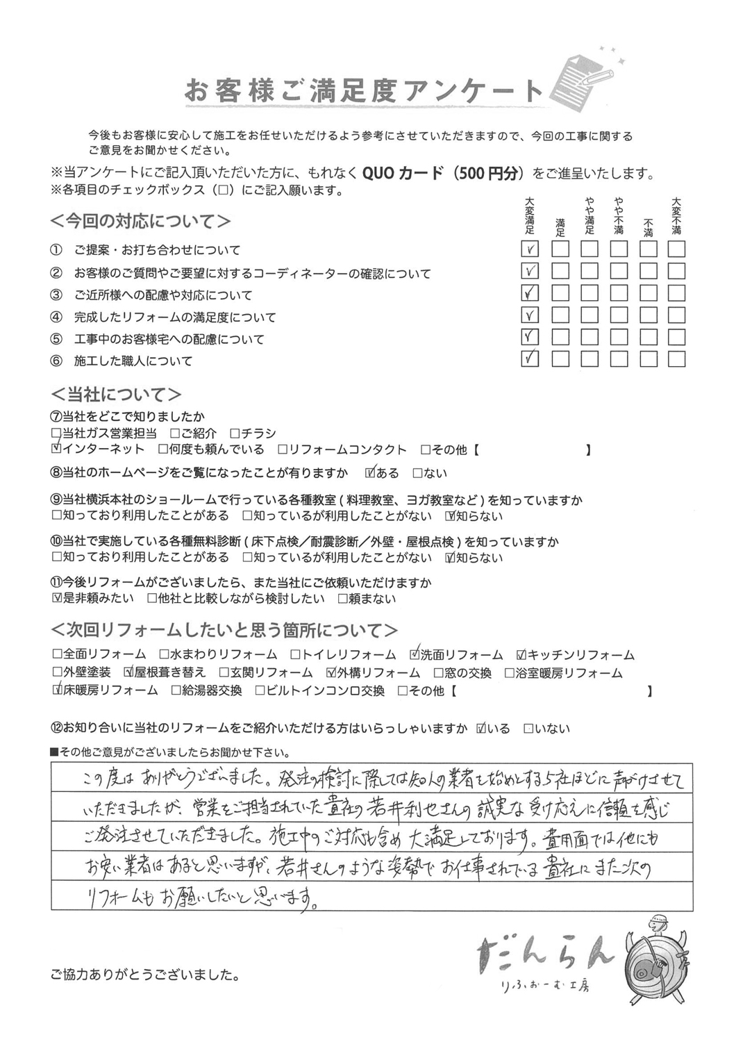 この度はありがとうございました。発注の検討に際しては知人の業者を始めとする5社ほどに声がけさせていただきましたが、営業をご担当されていた貴社の若井利也さんの誠実な受け応えに信頼を感じご発注させていただきました。施工中のご対応も含め大満足しております。費用面ではほかにもお安い業者はあるかと思いますが、若井さんのような姿勢でお仕事されている貴社にまた次のリフォームもお願いしたいと思います。