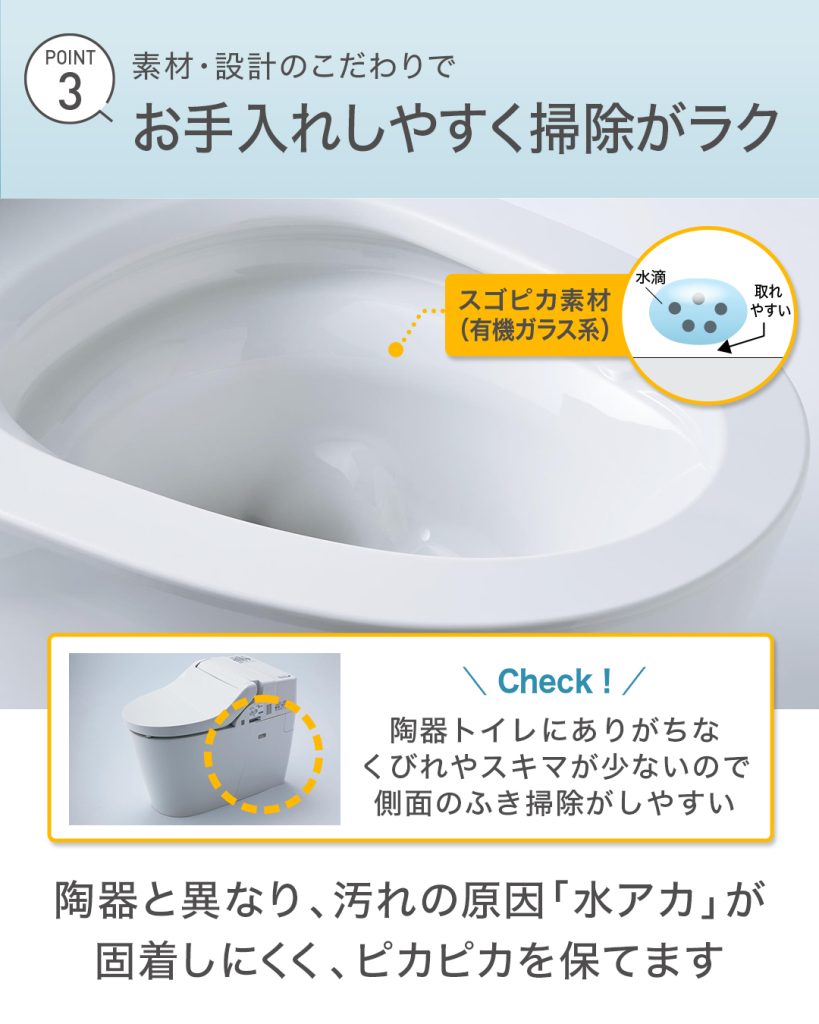 さらに、パナソニック独自の「#スゴピカ素材 」を採用しているので、汚れの原因となる水アカが付着しにくくお手入れもラク。少ない水で流しきる構造で、節水性も両立しています。